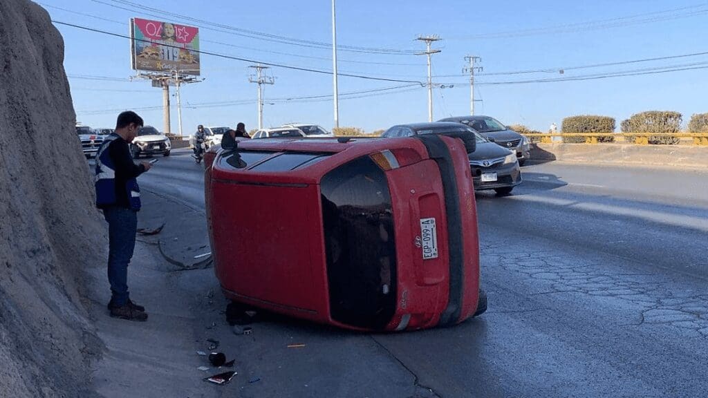 El percance ocurrió cuando el conductor de un vehículo Dodge Atos, de color rojo, perdió el control de la unidad y se impactó violentamente contra la pared del cerro, lo que ocasionó que el automóvil terminara volcado sobre la vía.