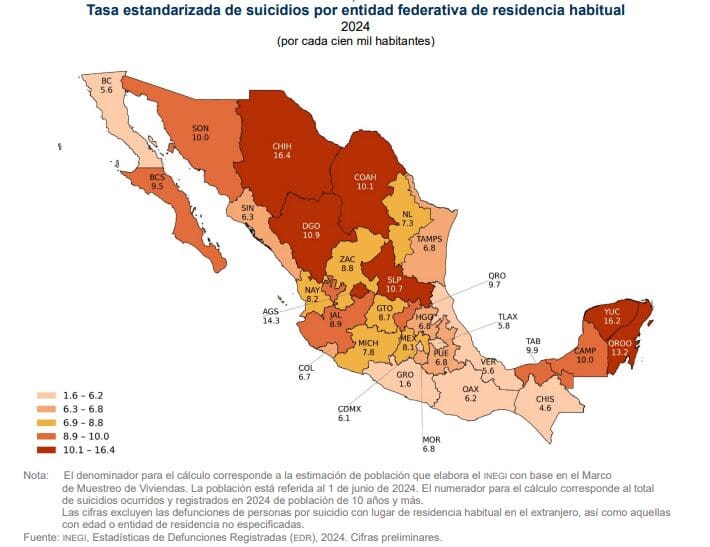 La información proporcionada por el Ichisam también muestra que el grupo de edad más afectado se encuentra entre los 15 y los 34 años. Dentro de esta población, el rango con la mayor incidencia fue el de 20 a 24 años, con 54 casos registrados, seguido por el grupo de 25 a 29 años con 53, el de 30 a 34 con 49 y el de 15 a 19 años con 48 muertes. Estas cifras reflejan un impacto significativo en la población joven, que concentra más de la mitad de los fallecimientos relacionados con suicidio en el estado.