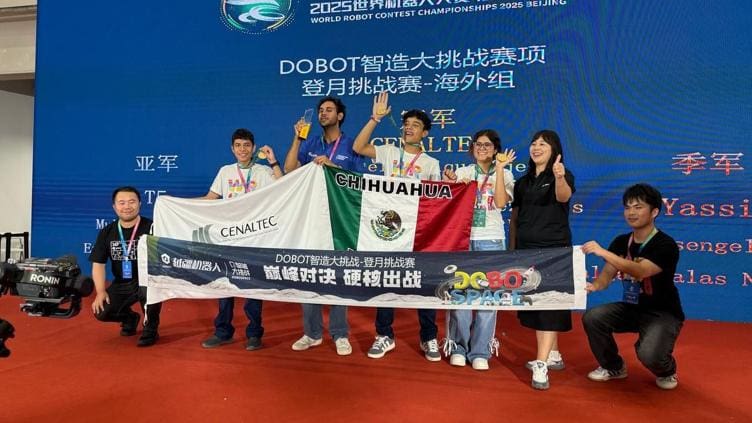 Un equipo chihuahuense conformado por estudiantes del CECyTECH Plantel 20 y del CBTis 122, pertenecientes al INADET/Cenaltec, se proclamó campeón mundial en la categoría Media Superior del reto DOBOT Intelligent Manufacturing Challenge – Moon Landing Challenge. Este evento formó parte de la World Robotics Conference 2025 (WRCC), considerada como los “Juegos Olímpicos de la Robótica”.