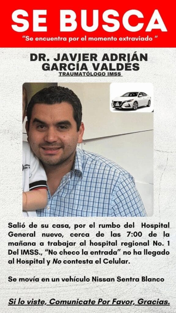 En Culiacán, Sinaloa, fue reportada la desaparición del médico traumatólogo Javier Adrián García Valdés, quien trabajaba para el Instituto Mexicano del Seguro Social (IMSS). De acuerdo con sus familiares, fue visto por última vez la mañana de este jueves 27 de junio, alrededor de las 7:00 horas, cuando salió de su domicilio rumbo a su lugar de trabajo.