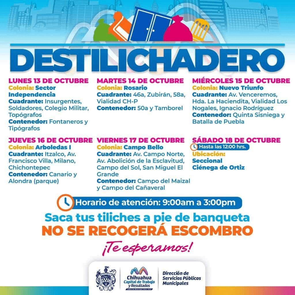 El Municipio recordó que el Destilichadero permite retirar residuos que el camión recolector convencional no puede transportar, como muebles viejos, colchones, escombro o ramas. El horario del servicio será de 9:00 a 15:00 horas, de lunes a viernes, y los sábados hasta las 12:00 del mediodía.