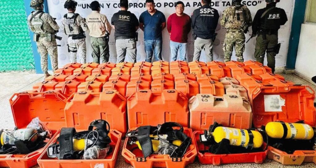Dos presuntos implicados en el robo a la plataforma Akal-R de Pemex fueron detenidos por autoridades de Tabasco; se recuperaron 30 equipos de respiración autónoma y una embarcación.
