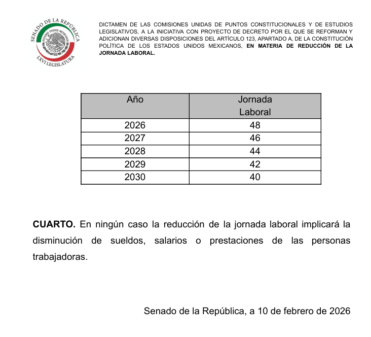 El dictamen de las 40 horas laborales llegó al Senado y propone reducir gradualmente la jornada semanal sin eliminar el sexto día de trabajo ni afectar salarios o prestaciones.