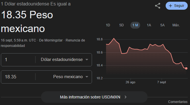 El peso mexicano se fortaleció este 16 de septiembre y llevó al dólar a 18.35 pesos, su nivel más bajo de 2025, en medio de expectativas de menores tasas en EE.UU.