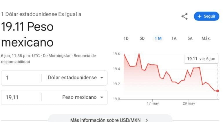 De acuerdo con el Banco de México, la cotización del dólar spot —referencia en las operaciones bancarias— se colocó en 19.10 pesos el viernes 6 de junio, lo que representó una caída de 29 centavos frente al cierre de la semana anterior. Aunque las instituciones financieras no operan los sábados, el tipo de cambio continuó cotizando libremente y se mantuvo en 19.11 pesos por dólar, según datos del mercado.