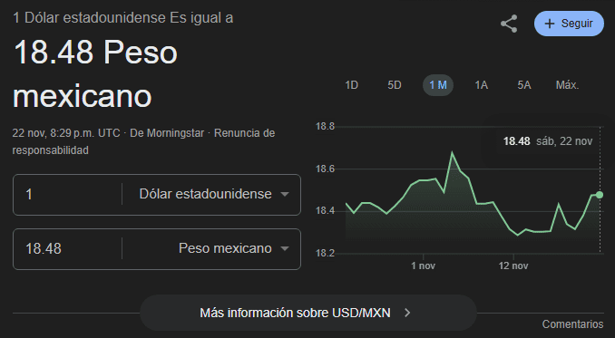 El Banco de México (Banxico) cerró la jornada del viernes 21 de noviembre con el dólar spot –tipo de cambio de referencia entre bancos– cotizando en 18.4847 pesos por unidad. Esta cifra refleja un avance respecto a la semana anterior, en la que el peso había mostrado mayor fortaleza.