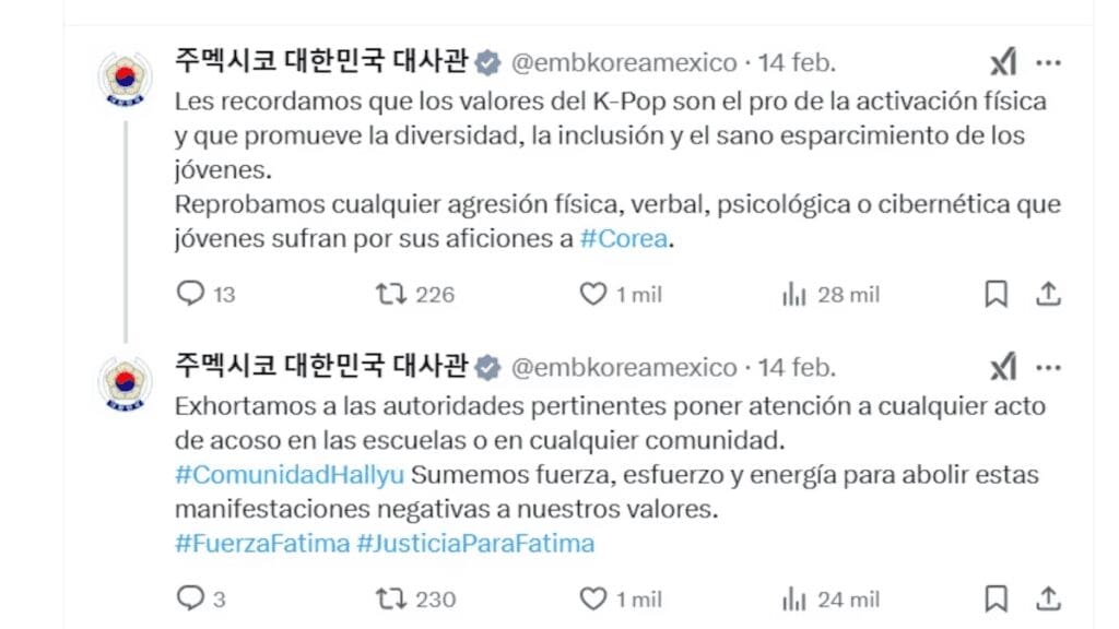 Ante la falta de respuesta por parte de las autoridades escolares, el caso se viralizó en redes sociales, donde la comunidad exigió justicia para la menor. En este contexto, la Embajada de la República de Corea en México emitió un comunicado en el que condenó enérgicamente el acoso y la agresión sufridos por Fátima. La embajada también expresó su apoyo a la cultura coreana y recordó que el gusto por el K-pop no debe ser motivo para ser víctima de violencia. Resaltaron los valores de la cultura coreana, como la inclusión, la diversidad y la tolerancia, y recalcaron que tales agresiones son contrarias a estos principios.