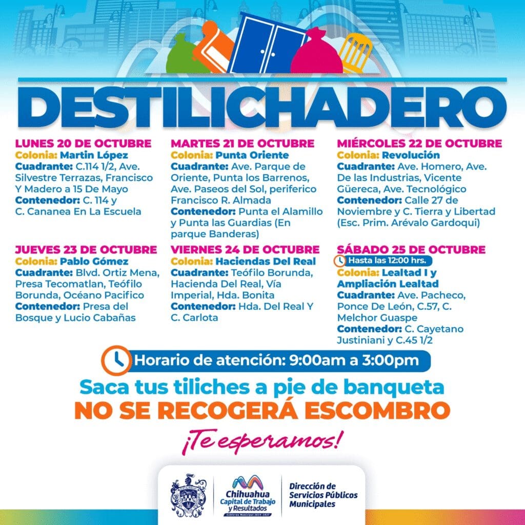 El Gobierno Municipal de Chihuahua, a través de la Dirección de Servicios Públicos, anunció que el programa Destilichadero visitará seis colonias de la ciudad del 20 al 25 de octubre, con el objetivo de ayudar a las familias a deshacerse de muebles viejos, colchones y objetos de gran tamaño que no son recolectados por el camión de basura habitual.
