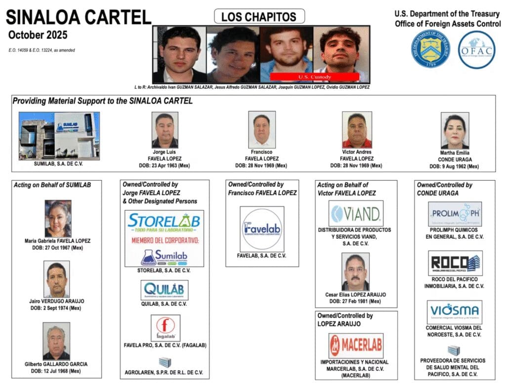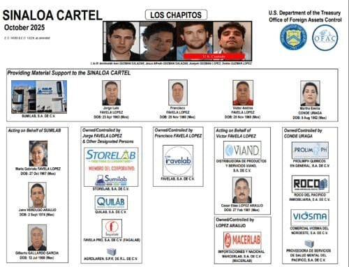 La Oficina de Control de Activos Extranjeros (OFAC, por sus siglas en inglés) señaló que cuatro hermanos de la familia Favela López —Víctor Andrés, Francisco, Jorge Luis y María Gabriela— están al frente de una red empresarial dedicada a operar compañías químicas en México. Estas empresas estarían involucradas en la cadena de producción del potente opioide, en beneficio de la facción del Cártel de Sinaloa liderada por los hijos de Joaquín «El Chapo» Guzmán.