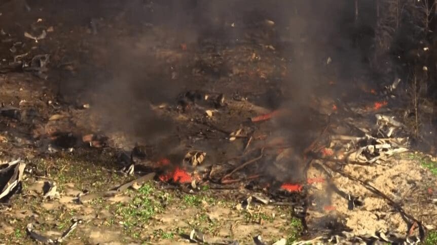 Imágenes aéreas difundidas por medios locales mostraron el sitio completamente arrasado: estructuras metálicas retorcidas, vehículos calcinados y una densa columna de humo sobre la zona boscosa de Bucksnort, a unos 97 kilómetros al suroeste de Nashville.