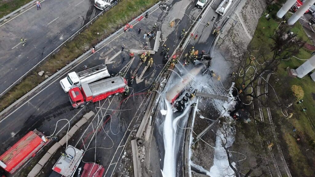 El accidente ocurrió alrededor de las 14:25 horas, cuando la unidad volcó, provocando una fuga masiva de gas que derivó en una explosión. La onda expansiva alcanzó 32 vehículos y causó quemaduras de segundo y tercer grado a personas de entre 1 y 60 años de edad. Imágenes difundidas en redes sociales muestran la nube blanca previa al estallido y las enormes llamaradas que obligaron a peatones y automovilistas a huir en medio del pánico.