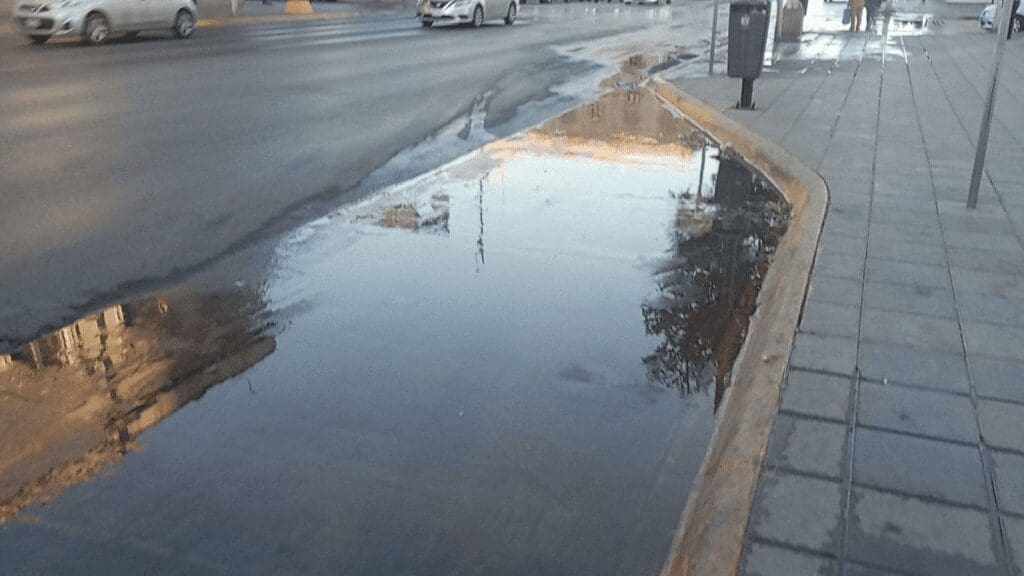 Desde primeras horas de la mañana, el escurrimiento ha dificultado el paso de los peatones, quienes se han visto sorprendidos al intentar cruzar la calle y terminar empapados por el agua acumulada. Además, los vehículos que circulaban por la zona han contribuido a la dispersión del líquido, generando mayores molestias tanto para conductores como para personas que transitan por el lugar.