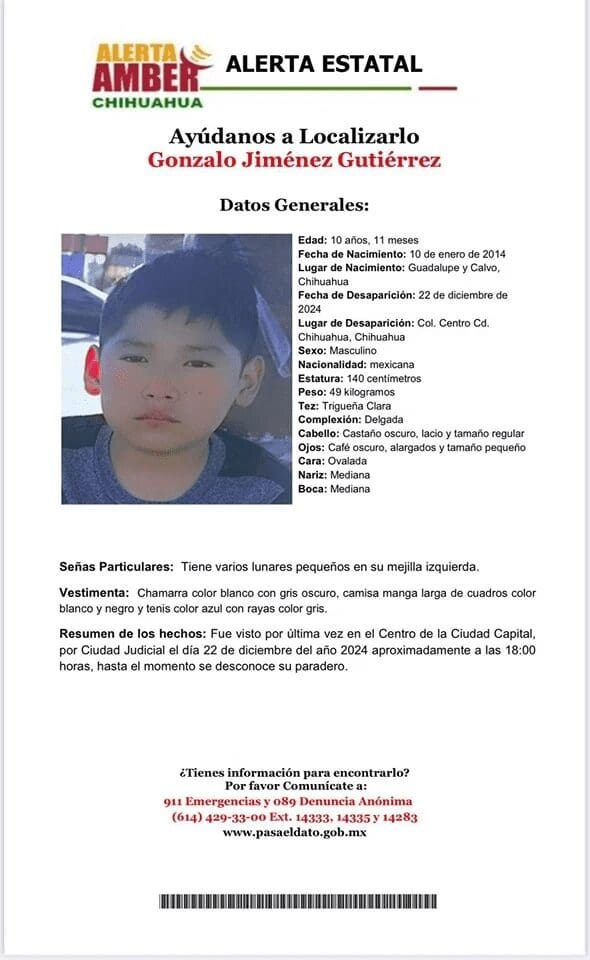 La Fiscalía General del Estado activó la Alerta Amber tras la desaparición de Gonzalo Jiménez Gutiérrez, un menor de 10 años visto por última vez el 22 de diciembre en Chihuahua.