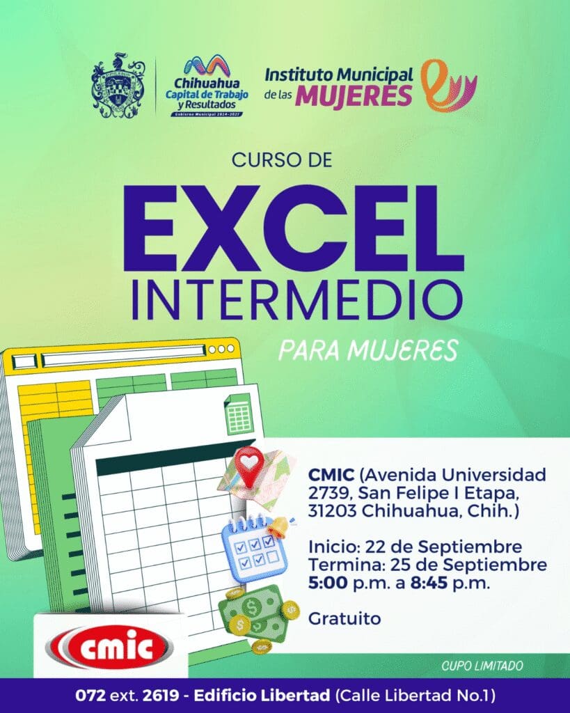 El Instituto Municipal de las Mujeres invita a chihuahuenses a inscribirse en su curso gratuito de Excel Intermedio, que se realizará del 22 al 25 de septiembre con cupo limitado.