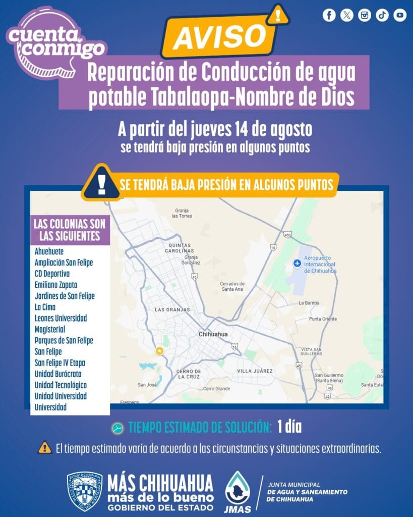 La Junta Municipal de Agua y Saneamiento (JMAS) de Chihuahua informó que este jueves 14 de agosto realizará trabajos de reparación en una fuga detectada en el conducto principal de agua potable Tabalaopa-Nombre de Dios, el cual tiene un diámetro de 24 pulgadas.