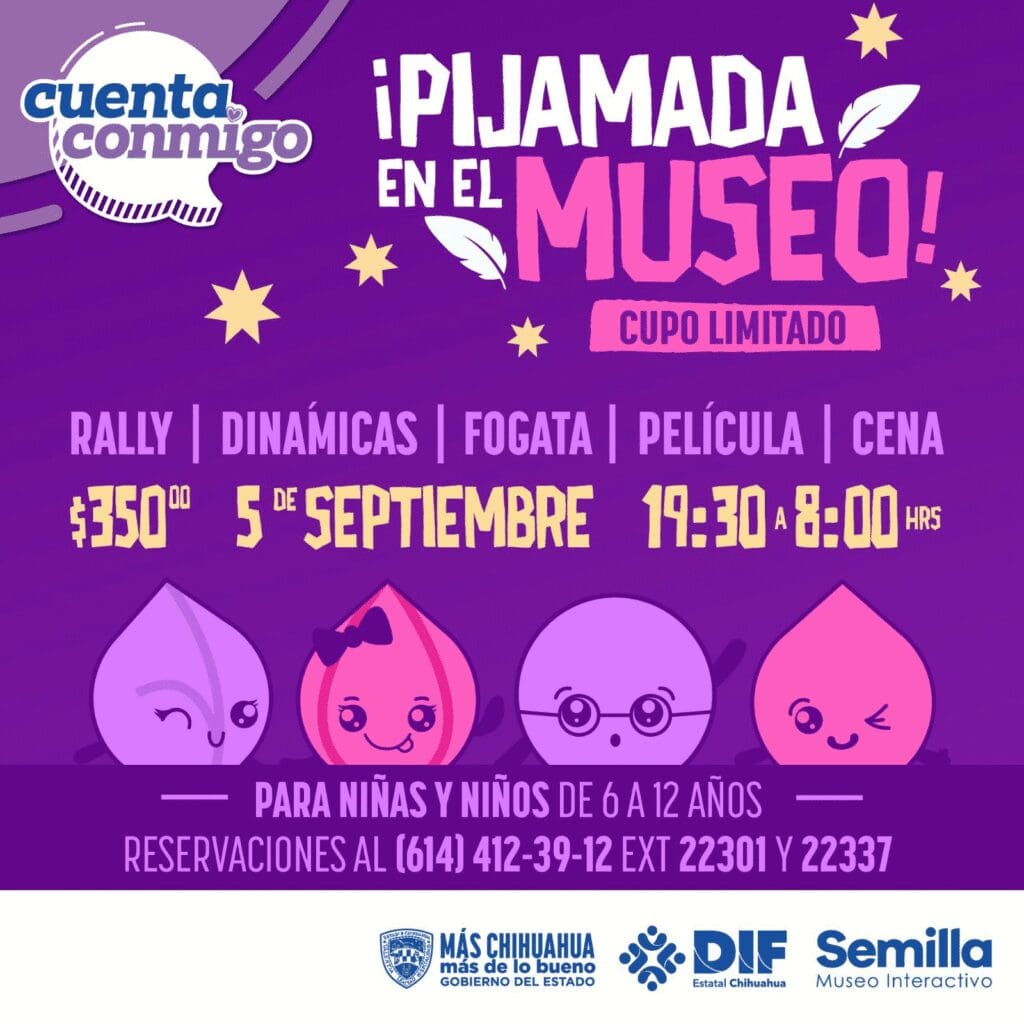 La pijamada se llevará a cabo desde las 7:30 de la tarde hasta las 8:00 de la mañana del día siguiente, dentro de las instalaciones del Museo Semilla, ubicado en la calle Progreso número 1201, en la colonia Centro de la ciudad de Chihuahua. El evento contará con cupo limitado, por lo que se invita a los padres y madres de familia a realizar el registro de sus hijos con anticipación para asegurar su lugar.