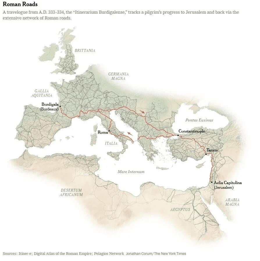 Entre las rutas romanas mejor documentadas destaca la descrita en el Itinerarium Burdigalense, un diario de viaje de un peregrino anónimo de Burdeos que recorrió unos 5,070 kilómetros hacia Jerusalén y de regreso entre los años 333 y 334 d. C. Al compararlo con Itiner-e, el recorrido podría alcanzar hasta 5,800 kilómetros. El viaje permitió registrar paisajes, construcciones religiosas y sitios bíblicos en un periodo en que el Imperio mostraba signos de fragmentación y las conexiones regionales comenzaban a debilitarse.