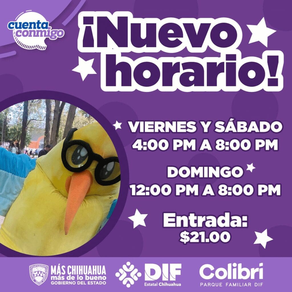El DIF Estatal anunció un cambio en el horario del Parque Infantil “El Colibrí”, con el objetivo de brindar a las familias chihuahuenses más tiempo para convivir, jugar y disfrutar de este espacio recreativo al aire libre. La medida busca promover momentos de esparcimiento en un ambiente seguro, especialmente durante las tardes y fines de semana.