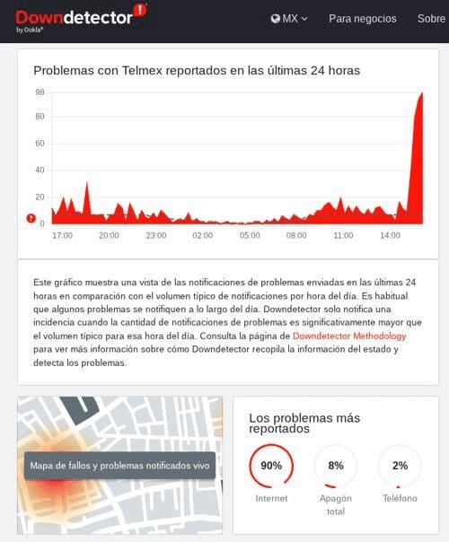 El portal especializado Downdetector, que se encarga de registrar caídas y fallas de servicios digitales, confirmó un incremento en los reportes relacionados con Telmex. Según sus datos, el 90% de los usuarios señalaron «problemas de internet», mientras que otro 8% reportó una desconexión total de todos los servicios.