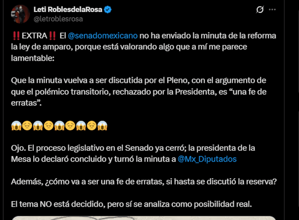 Esta situación generó fuertes críticas tanto en el ámbito político como en el jurídico. La periodista Leticia Robles de la Rosa alertó a través de la red social X que el Senado estudia corregir el transitorio mediante una “fe de erratas”, una figura legislativa usada para corregir errores de forma, pero que en este caso modificaría el fondo de lo aprobado: