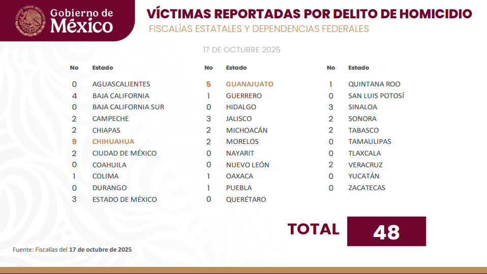 De acuerdo con los registros oficiales, se contabilizaron 134 homicidios a nivel nacional en ese periodo: 48 el viernes, 34 el sábado y 52 el domingo. Dentro de ese total, Chihuahua concentró nueve muertes violentas el viernes, ninguna el sábado y tres el domingo.