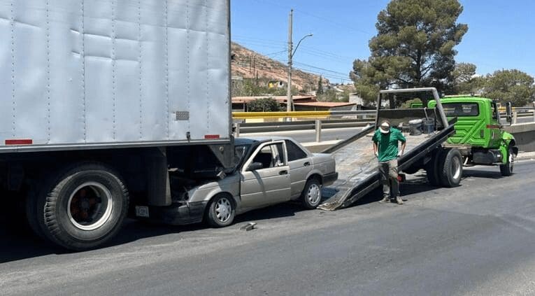 De acuerdo con los primeros reportes, el conductor del Tsuru, de color arena, no logró frenar a tiempo ante el tráfico denso y terminó por estrellarse violentamente contra el camión detenido. El impacto fue lo suficientemente fuerte como para que el auto quedara parcialmente incrustado debajo del vehículo de carga, provocando daños significativos en la carrocería del Tsuru y afectaciones en la parte posterior del camión.