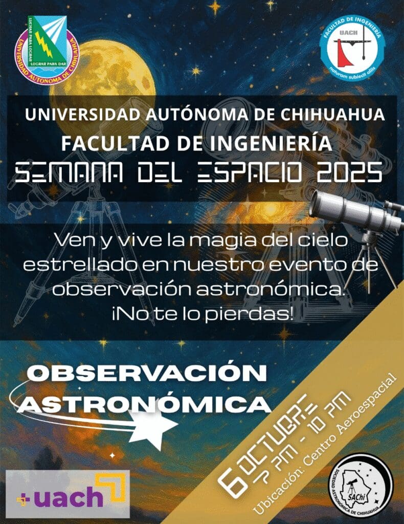 La Universidad Autónoma de Chihuahua (UACH) invita a la ciudadanía a sumarse a la Semana del Espacio 2025, una celebración internacional que busca acercar la ciencia y la exploración del universo a todas las personas. Como parte de esta conmemoración, se llevará a cabo una observación astronómica gratuita el próximo 6 de octubre, en las instalaciones de la Facultad de Ingeniería, ubicada en el campus dos de la universidad.